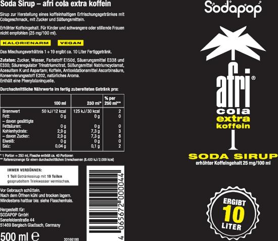 Produktinformationen "SODAPOP AFRI Cola Extra Koffein Sirup 500ml für 10 Liter"