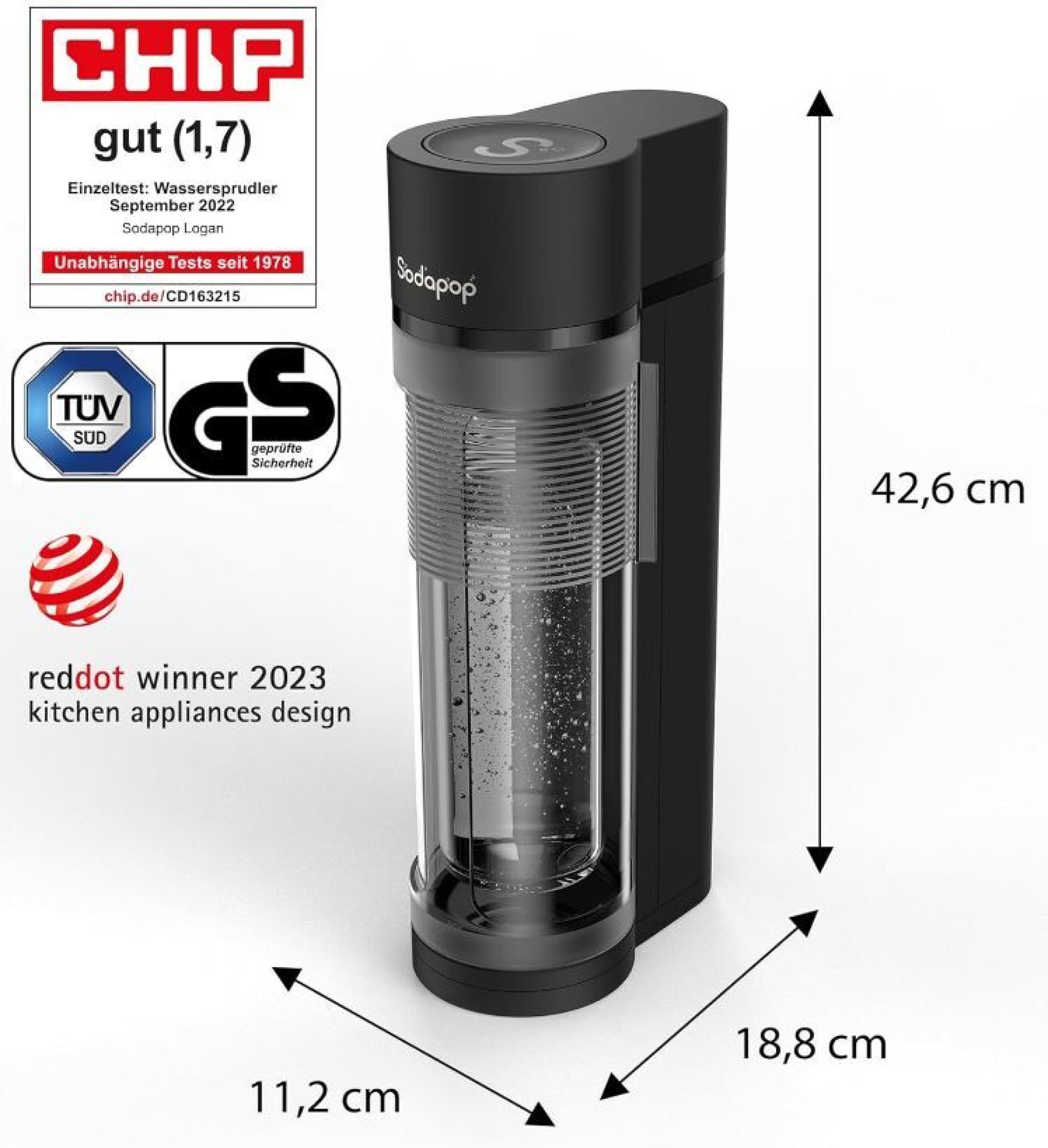 Produktinformationen "SODAPOP Wassersprudler Logan matt schwarz, 2x 850ml + 1x 600ml Glasflaschen + 1x CO² Zylinder"