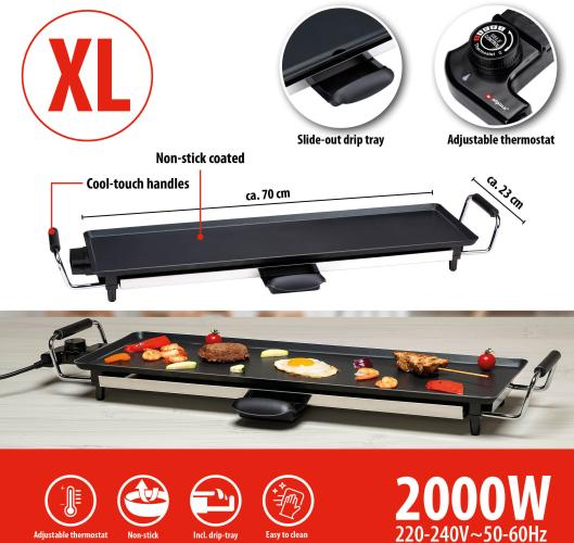 | Kurzbeschreibung: | 220-240V / 50-60Hz, | 2000W | Größe der Platte: 70 x 23 cm, Dicke der Platte: 2,0 mm | Antihaft-Beschichtung, Cool-Touch-Griffe| 1,0 m langes Stromkabel mit Temperaturregler (abnehmbar) |Tropfschale |