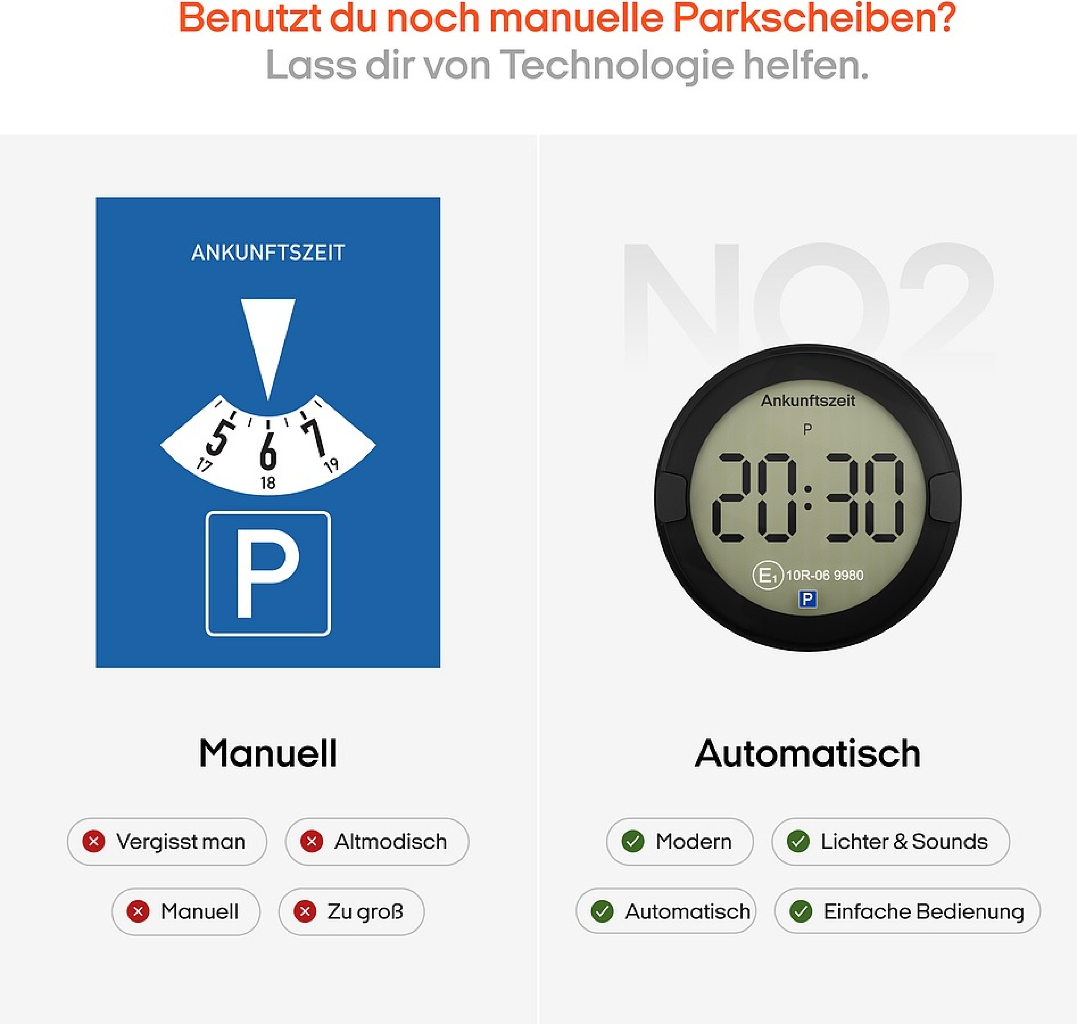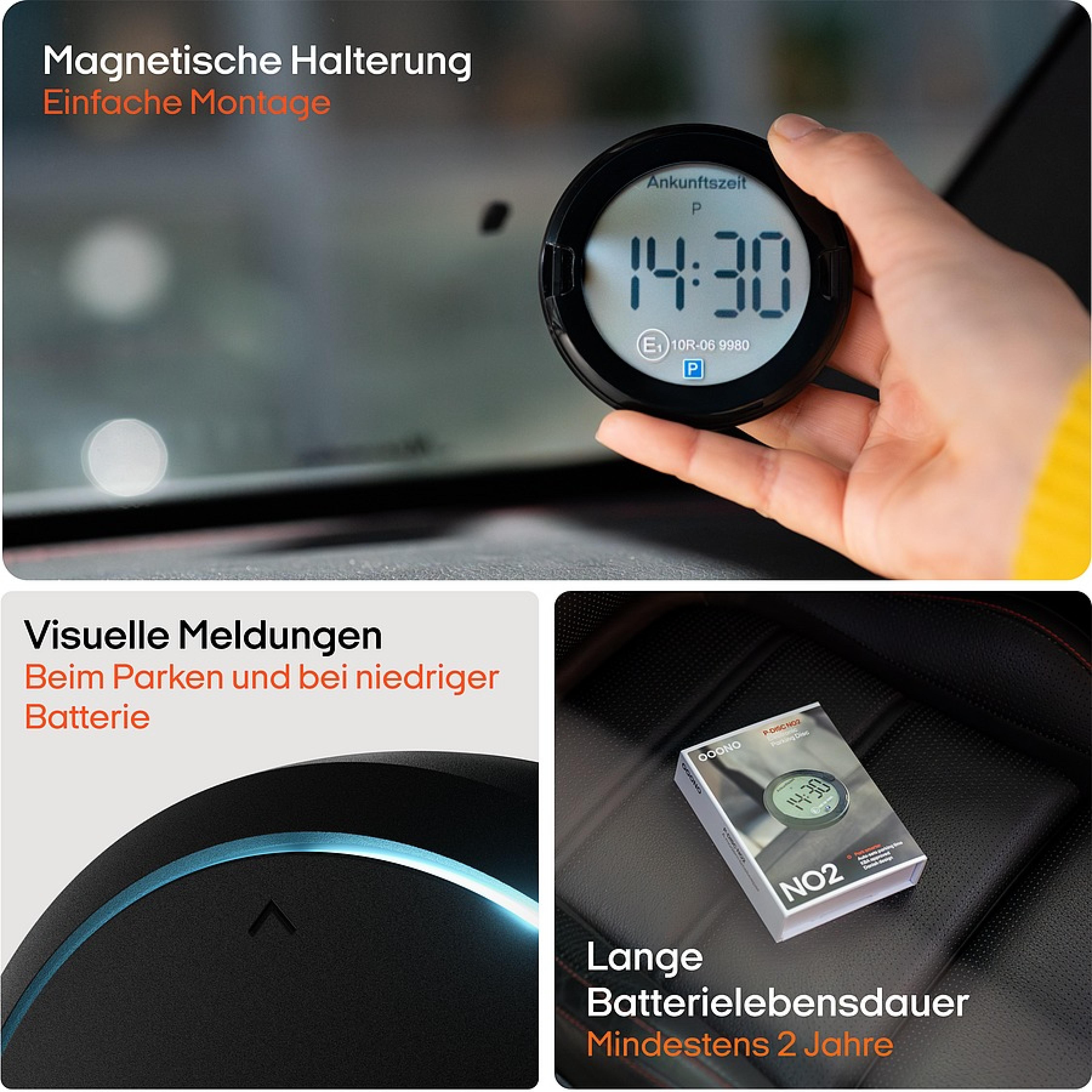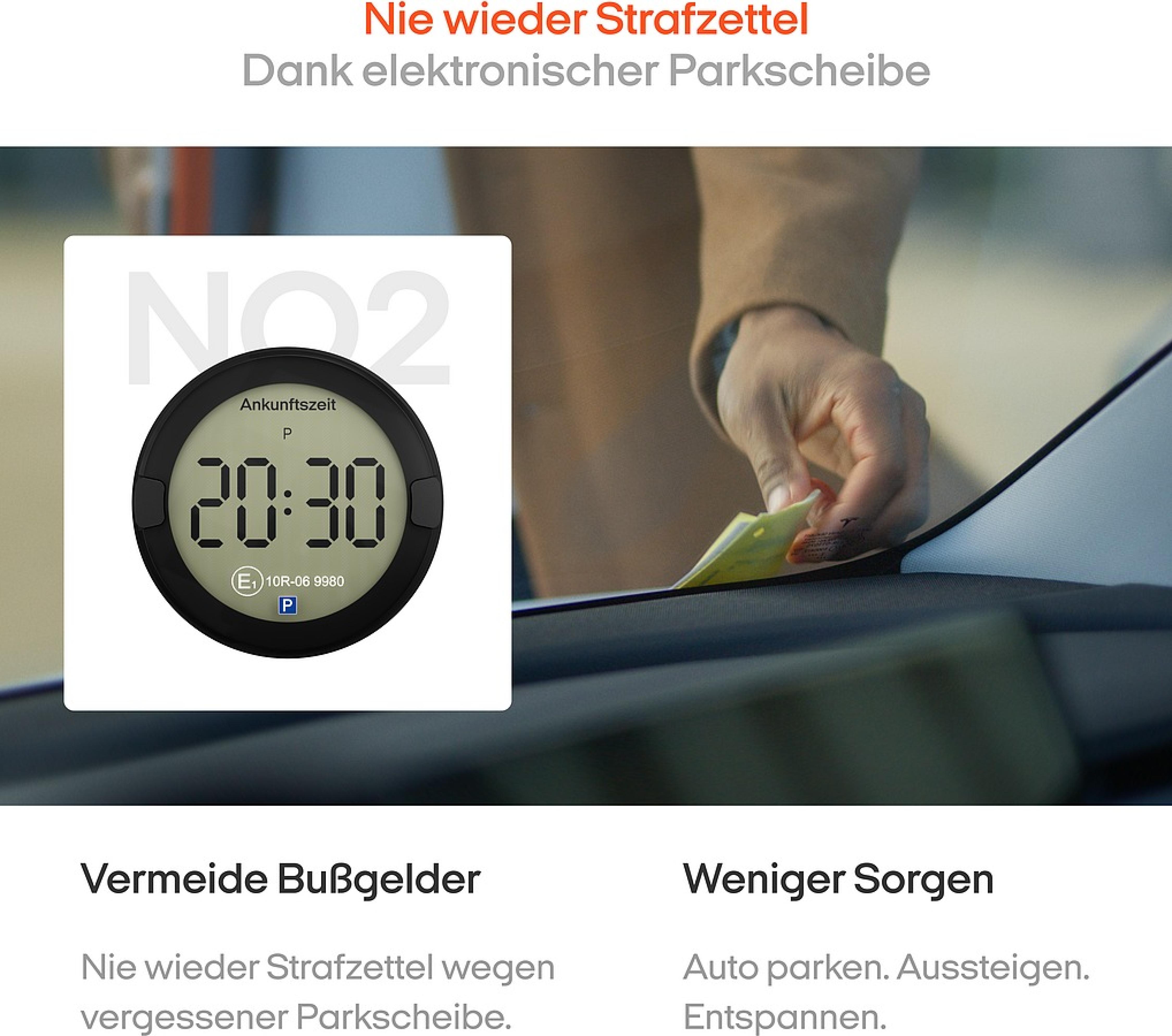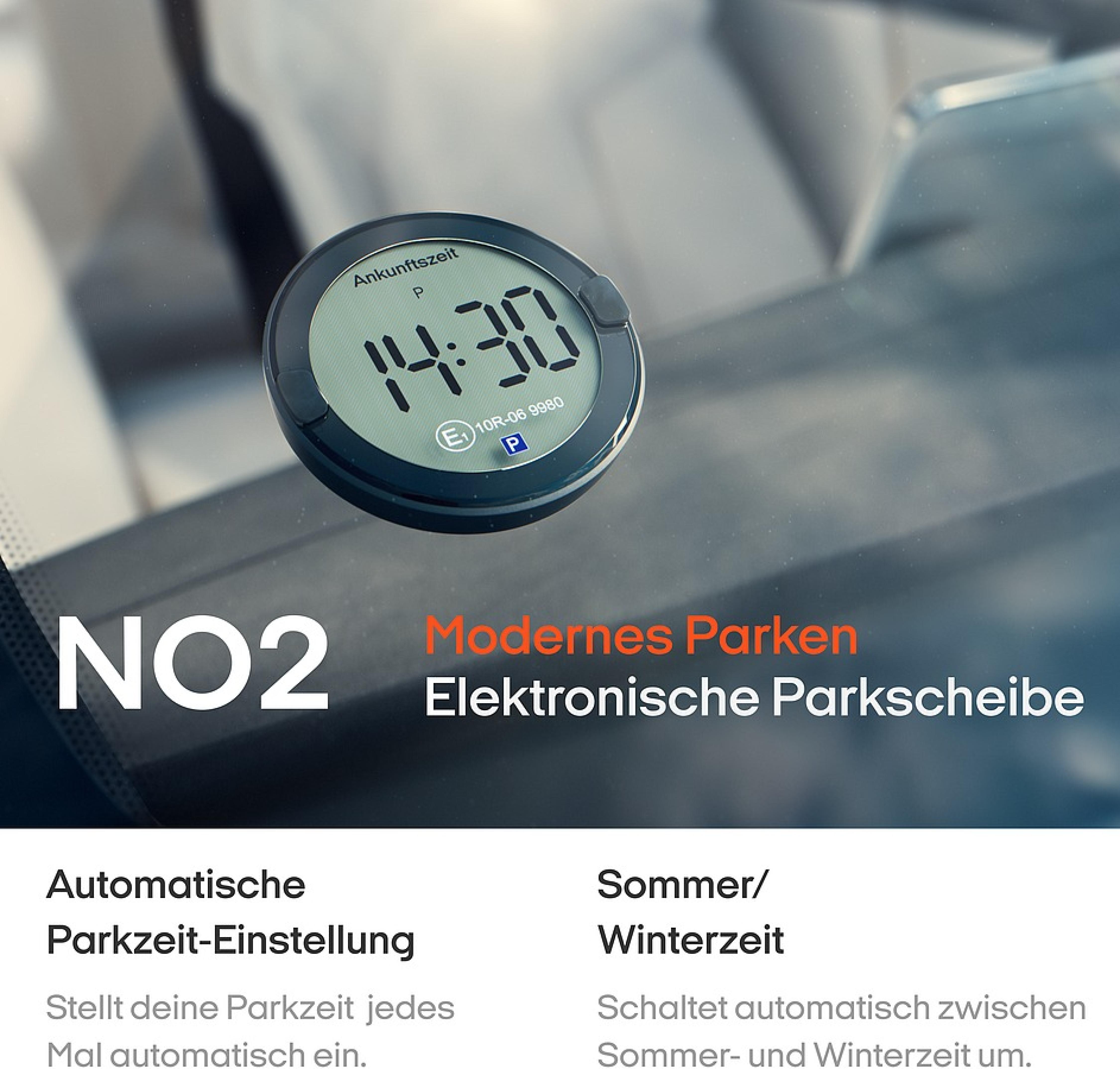 Mit der elektronischen Parkscheibe OOONO P-DISC NO2 musst du dir nie wieder Gedanken darüber machen, die Parkzeit einzustellen. Jedes Mal, wenn du dein Auto parkst, stellt sie sich automatisch ein.