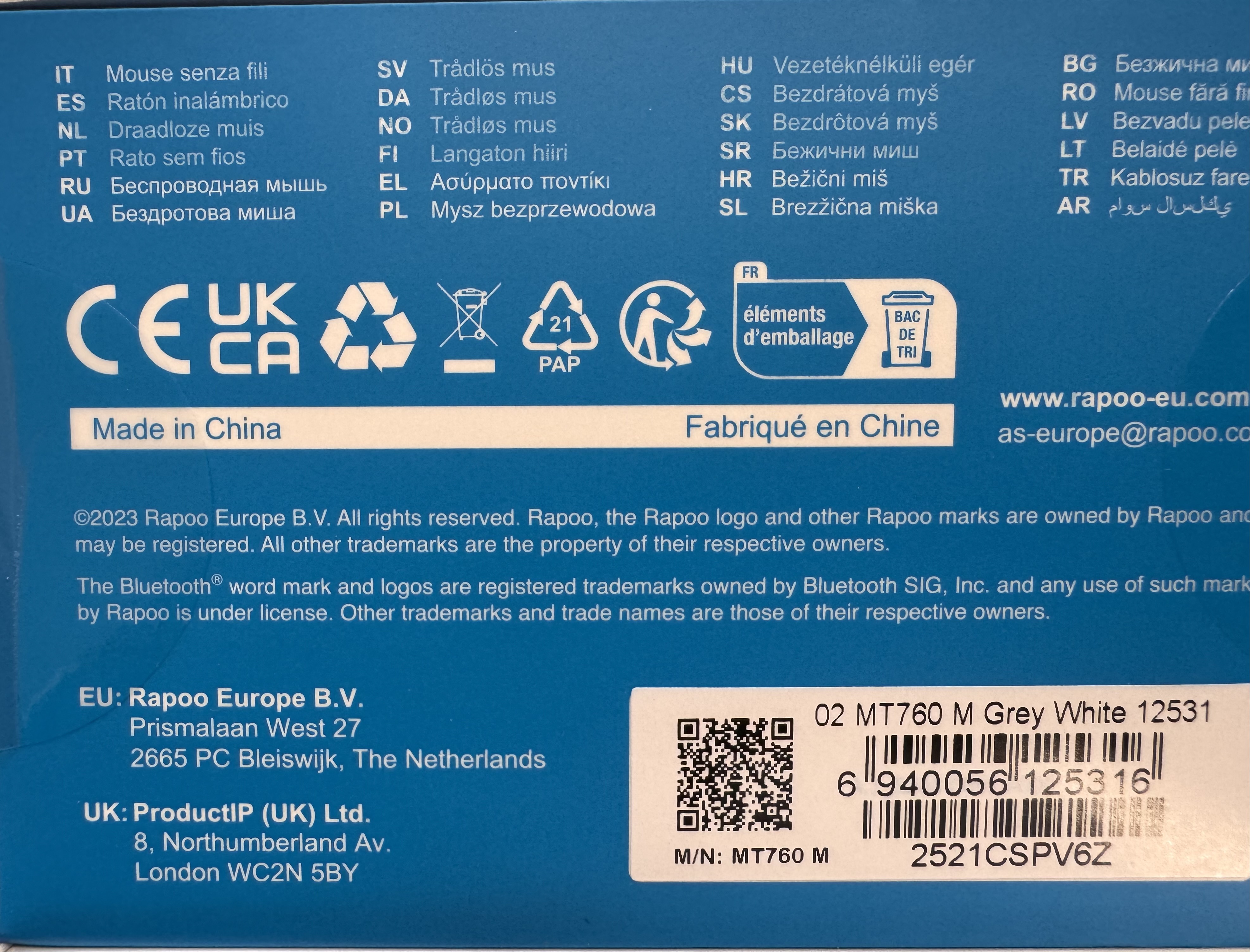 Produktinformationen "RAPOO MT760M - rechargeable Mouse Wireless, Bluetooth Grey White"