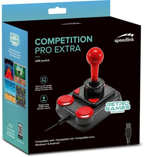 Der COMPETITION PRO EXTRA USB-Joystick ist eine Liebeserklärung an nostalgische Computerspiele. Sein Design mit dem unverwechselbaren Arcade-Automaten-Stick und die Technik zum Beispiel die ikonisch laut klickenden Mikroschalter im Inneren entsprechen dem originalen COMPETITION PRO aus den Achtzigern, dem berühmt-beliebten Joystick für Heimcomputer. Ganz in diesem Sinne ist er digital ausgelegt und für Arcade- und Retro-Spiele geeignet. Damit dir diese auch gleich zur Verfügung stehen, erhältst du zusätzlich zu deinem COMPETITION PRO EXTRA 25 Spiele zum Download darunter neu interpretierte Retro-Perlen wie Summer Games sowie Arcade-Titel im Geiste großer Heimcomputer-Klassiker. Der Joystick ist dank DirectInput® schnell und treiberlos installiert und direkt einsatzbereit. Beim Zocken profitierst du von seinen zwei runden und zwei dreieckigen Feuertasten sowie dem Schnellfeuer-Modus. Nutzen kannst du deinen COMPETITION PRO EXTRA am PC ab Windows® 7 aufwärts und (ganz im Sinne der Neuzeit) an Android®-Geräten via OTG-Adapter. Auf gehts in die Achtziger!